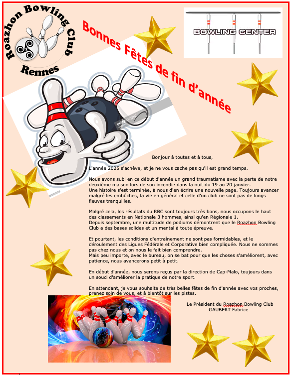 ATTENTION : en championnat Jeunes 2ème journée: du fait de l’indisponibilité du bowling de Dinan le dimanche 30 Novembre, la compétition se déroulera le samedi 29/11/25, début 9H30.